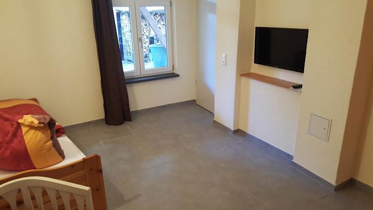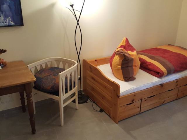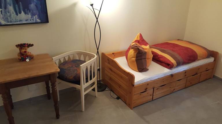 Die Ferienwohnung Zimmer bietet eine angenehme Atmosphäre mit einem Schlafzimmer und einem Badezimmer, das mit einer Dusche ausgestattet ist. Zur Unterhaltung steht ein Satelliten Flachbild-TV zur Verfügung. Zudem sind Handtücher und Bettwäsche inkludiert.