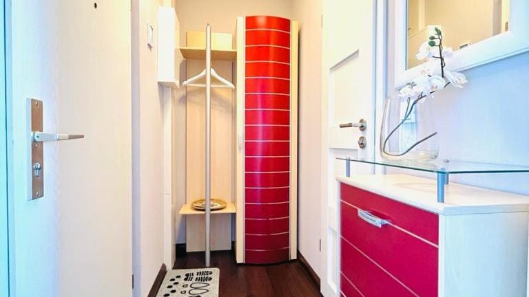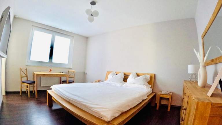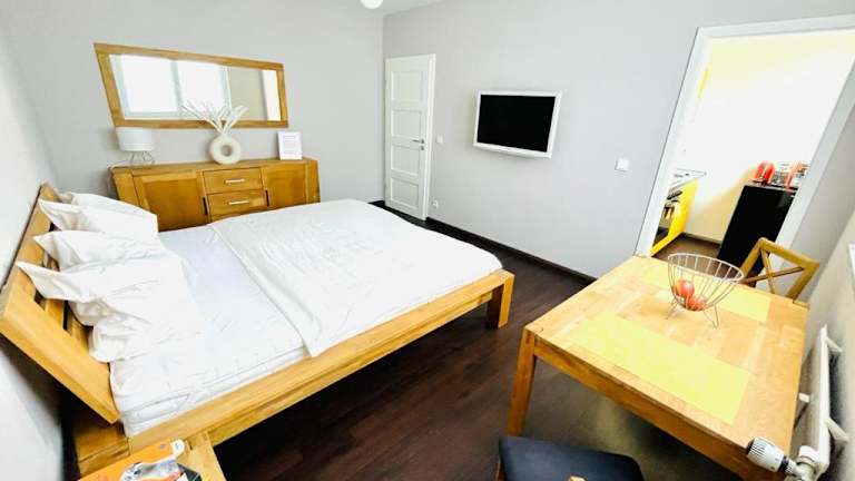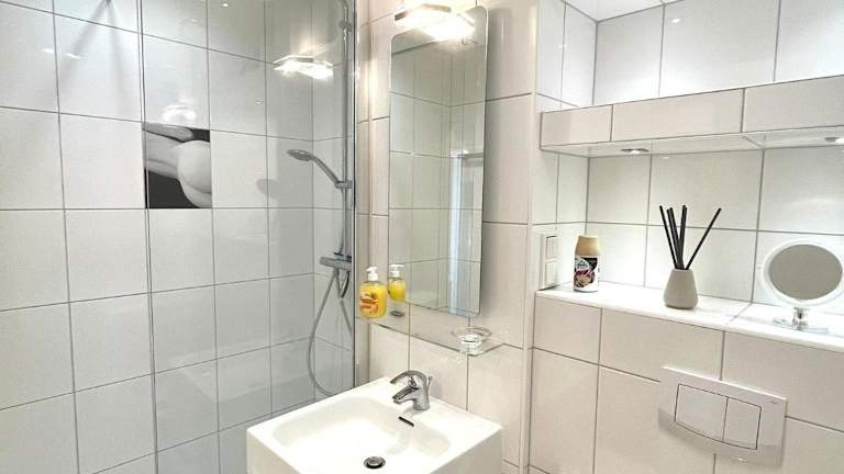 Die Ferienwohnung verfügt über ein Schlafzimmer, ein gut ausgestattetes Badezimmer mit Dusche sowie eine Küche mit Kühlschrank und Ofen. Des Weiteren sind Handtücher und Bettwäsche verfügbar.