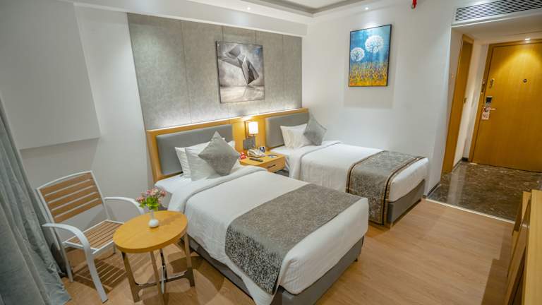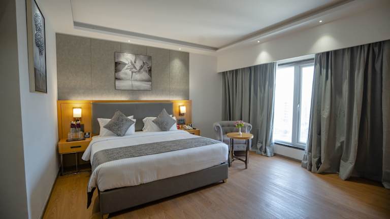 Die klimatisierten Zimmer verfügen über ein Kingsize-Bett und können mit Zustellbetten ausgestattet werden. Zur Ausstattung gehören ein Safe, eine Tee-/Kaffeemaschine, ein Bügelset sowie ein Telefon und Sat-TV. Im Badezimmer gibt es eine Dusche mit Haartrockner und Bademänteln. Die Gäste finden in den Zimmern Hausschuhe und die Tageszeitung vor.