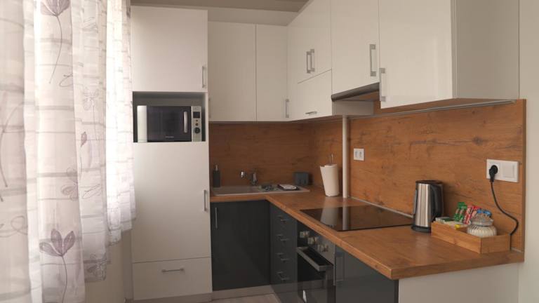 Die Ferienwohnung verfügt über eine voll ausgestattete Küche mit Kühlschrank und Wasserkocher, was die Zubereitung eigener Mahlzeiten ermöglicht. Keine Informationen zu Verpflegungsmöglichkeiten wie Frühstück, Halbpension oder Ähnlichem sind vorhanden.