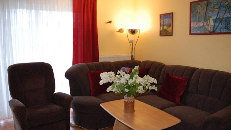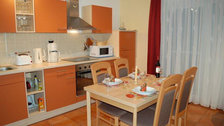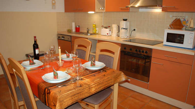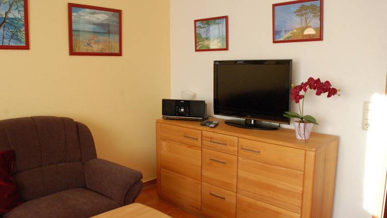 Die Ferienwohnung umfasst ein Schlafzimmer, ein Badezimmer mit Dusche, ein Wohnzimmer samt Essbereich sowie eine voll ausgestattete Küche mit Kühlschrank, Geschirrspüler und Ofen. Zudem bietet die Wohnung einen Flachbild-TV, einen Blu-ray-Player, einen DVD-Player und einen CD-Player.