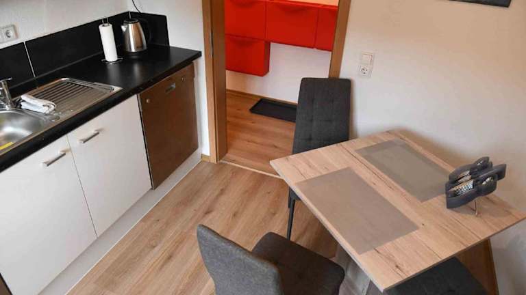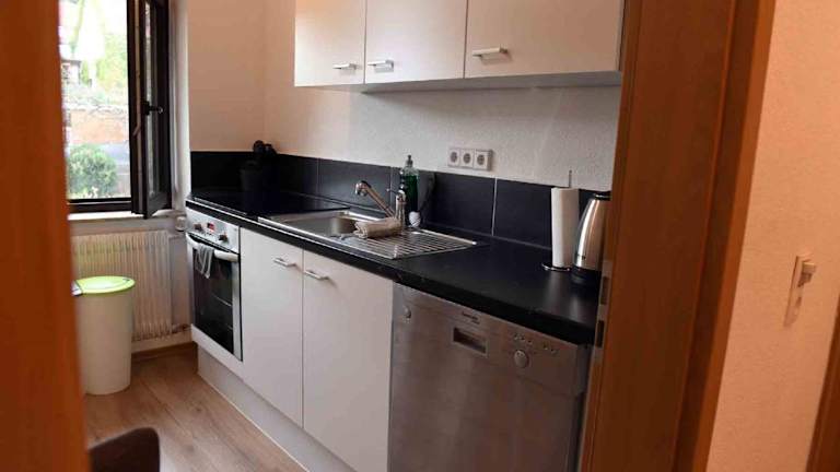Die Ferienwohnung besteht aus einem Schlafzimmer, einem Wohnzimmer und einer voll ausgestatteten Küche mit Kühlschrank und Wasserkocher. Das Badezimmer ist mit einer Dusche und einem Haartrockner ausgestattet. Handtücher und Bettwäsche werden bereitgestellt.