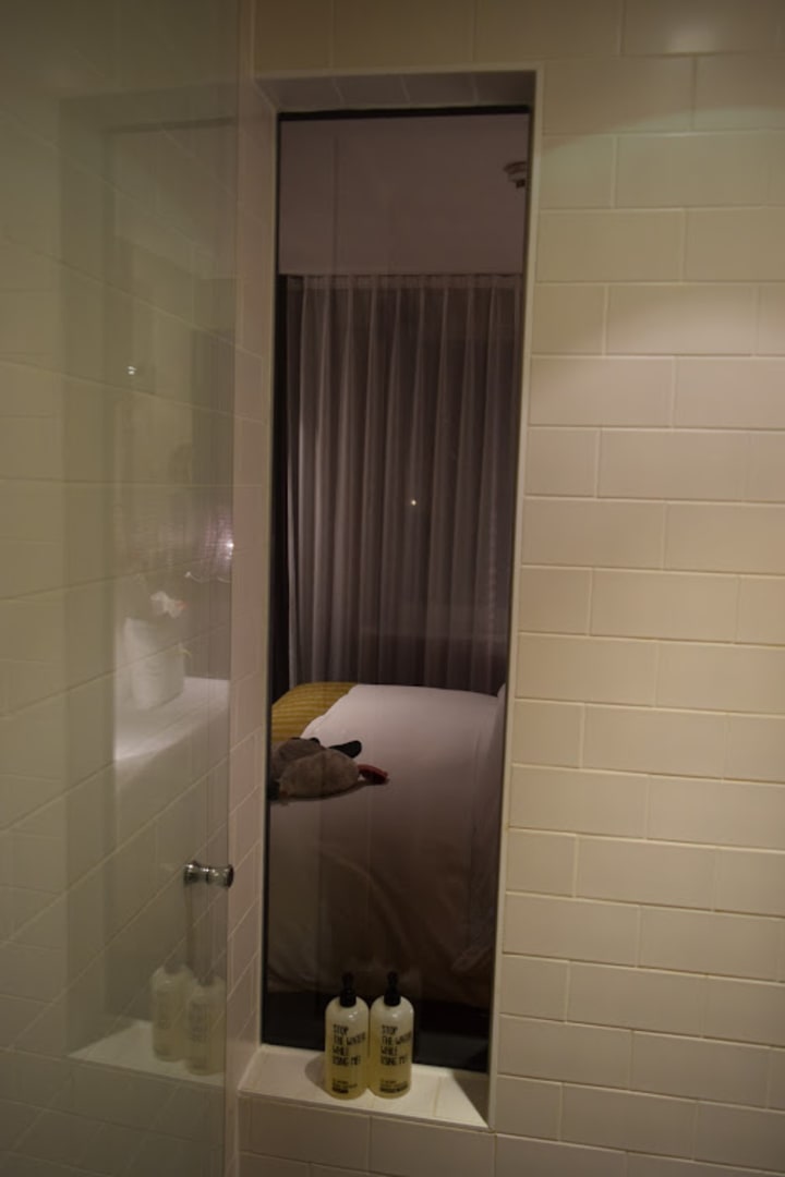 Fenster von der Dusche ins Zimmer