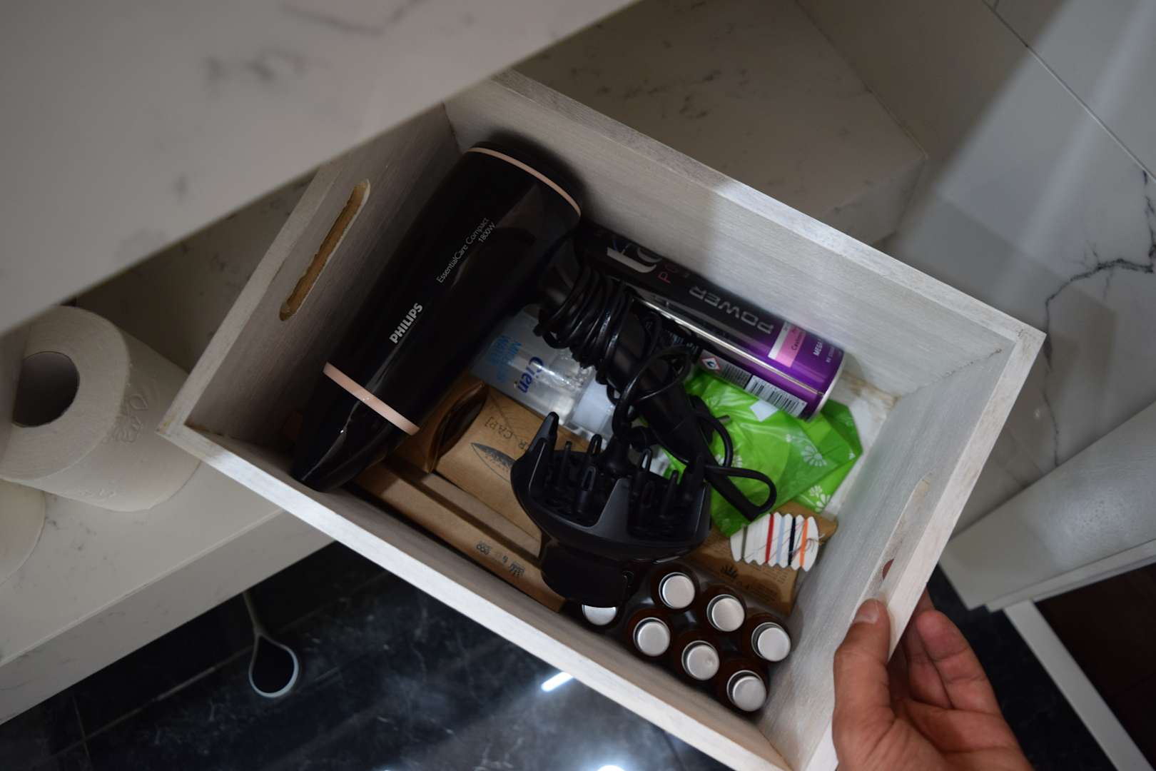 Allerhand Verbrauchsmaterial im Badezimmer. Vom Haarspray bis zur Zahnbürste.