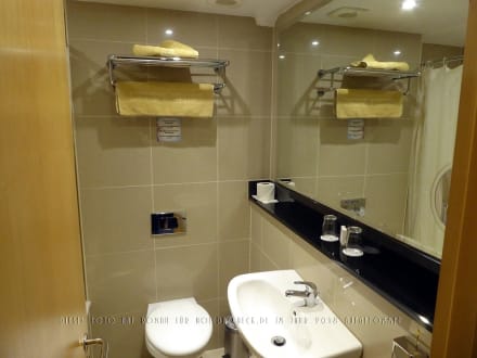 Das kleine, kompakte Bad, bei dem der Handtuchhalter praktisch oberhalb der Toilette angebracht war, so dass die Bewegungsfreiheit beim Duschen nicht eingeschränkt war.