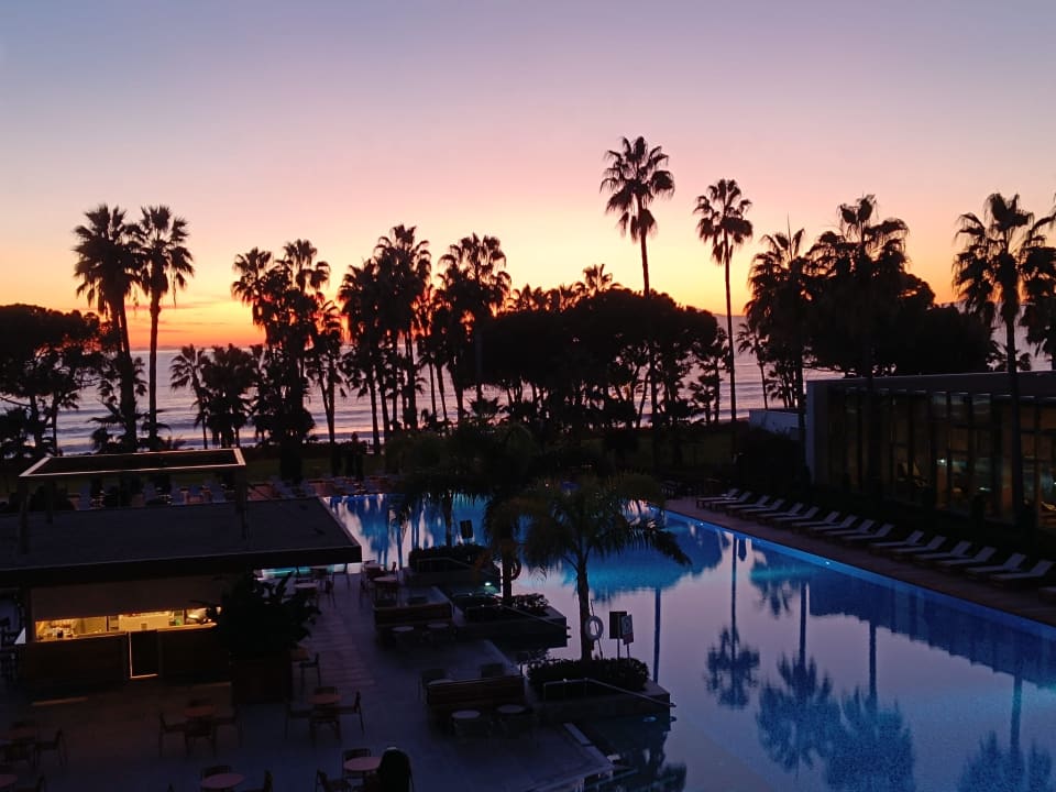 Blick über den Pool aufs Meer bei Nacht