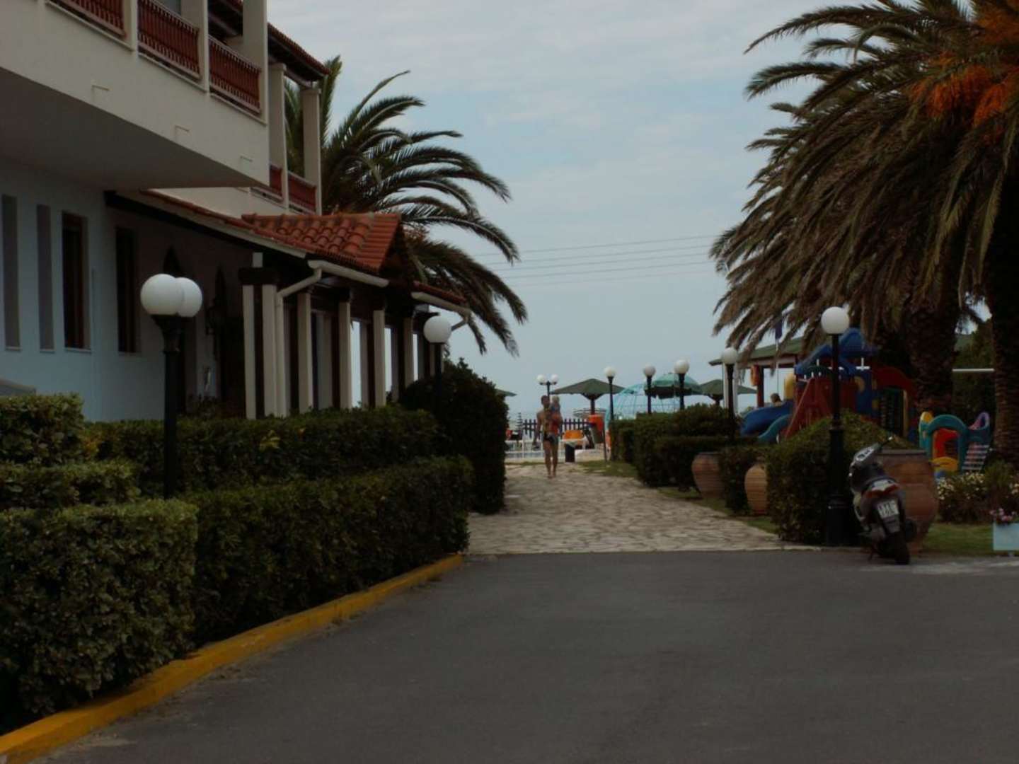 Achravie Beach HotelHauphaus (links) mit dem Speilplatz (rechts) und dem Weg zum Pool / Strand
