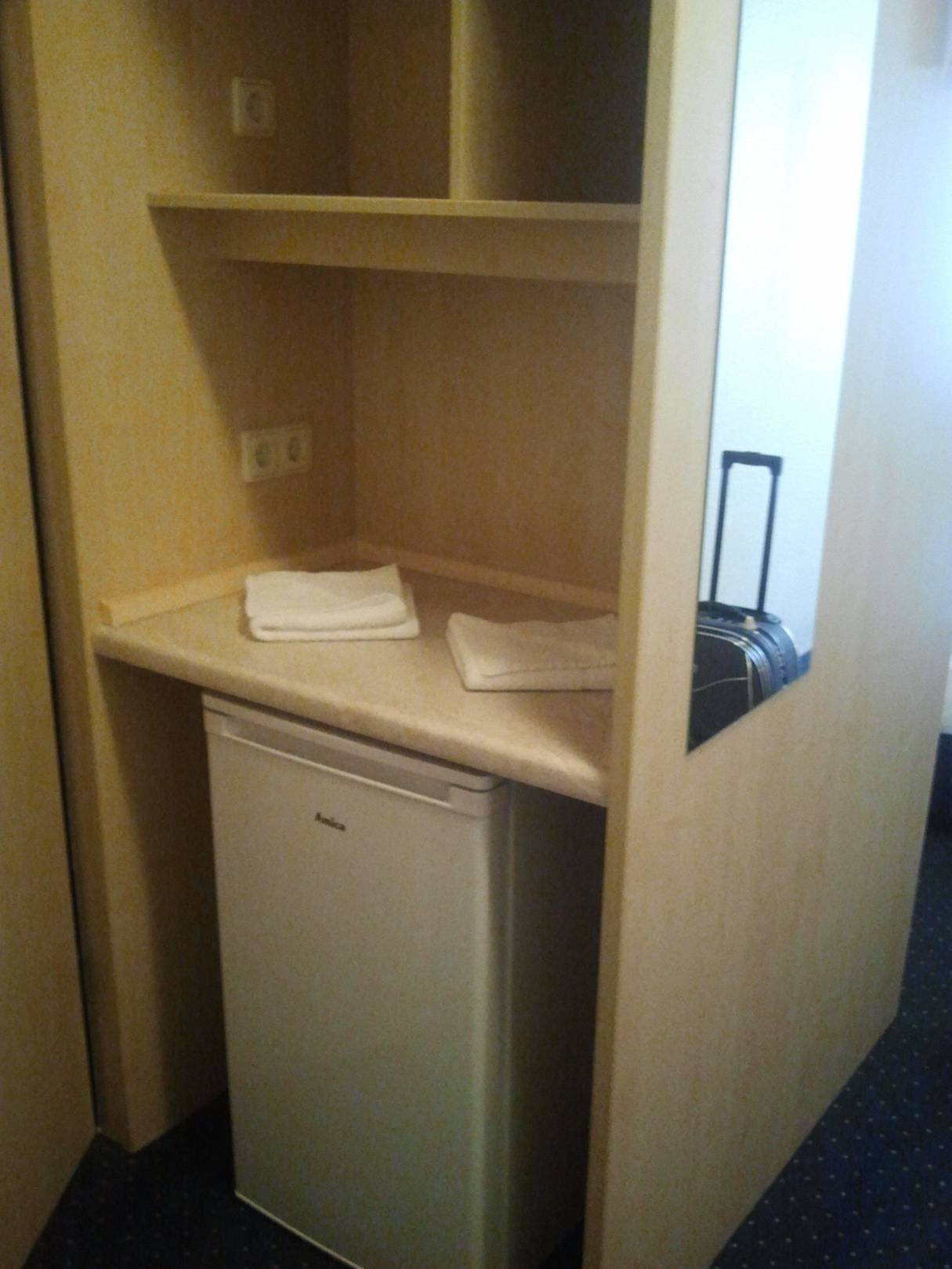 Kühlschrank gegenüber vom Waschbecken.