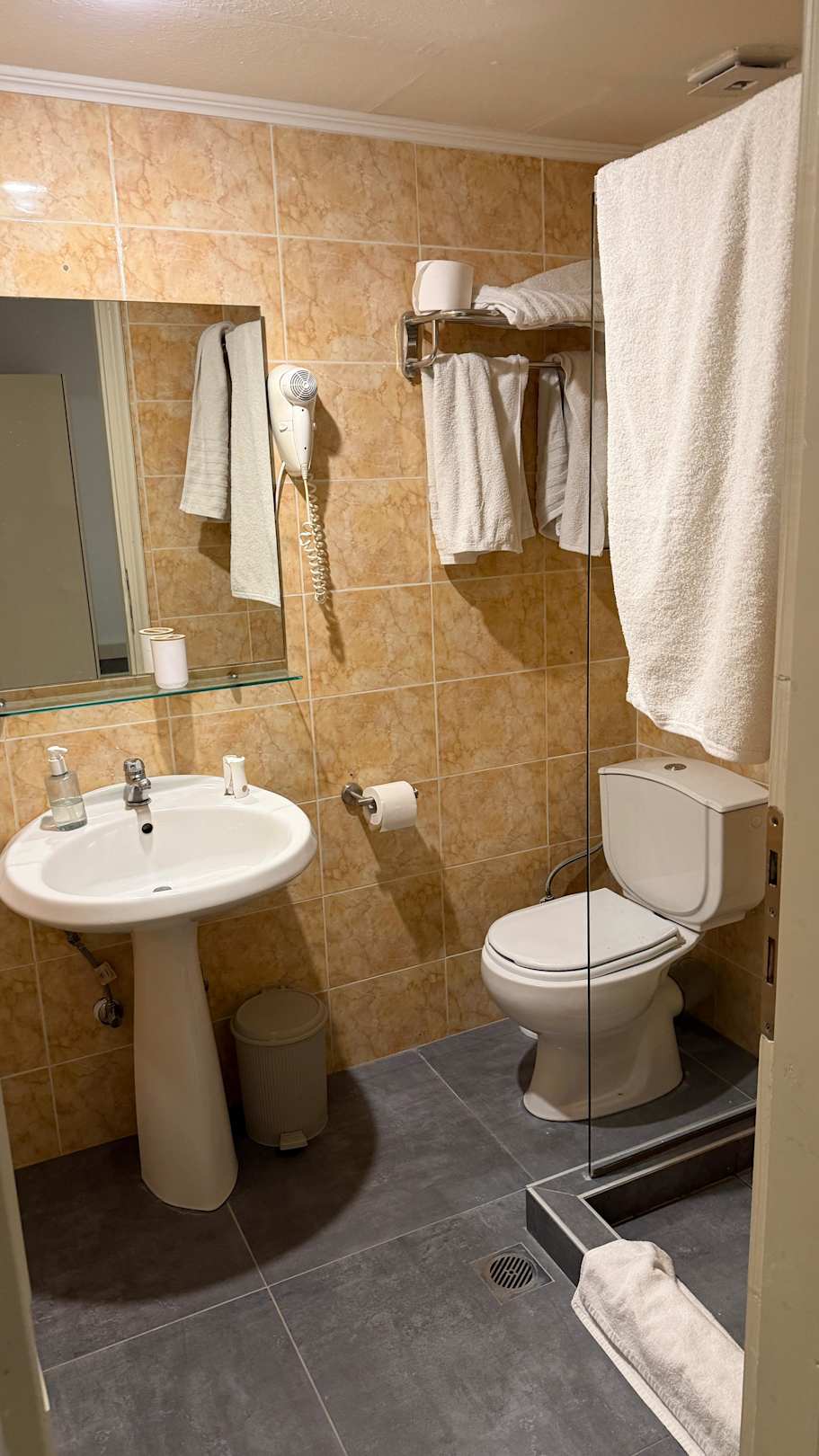 ZimmerBadezimmer mit Dusche. Leider hat die Dusche nur eine Seitenscheibe, das bedeutet, dass nach dem Duschen das halbe Badezimmer unter Wasser steht. Aber ein Ablauf ist vorhanden. Trotzdem sehr störend. Es gehört eigentlich eine Duschdrehtüre davor