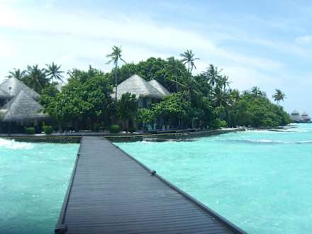 Blick von den Wasserbungalows zur Insel