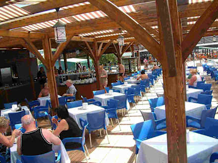 Viele Sitzplätze an der Strandbar. ca. 30 versch. Salate, Obst, frisch gegrilltes Fleisch, Pommes, Nudeln, Truthahn....mehrere Gerichte jeden mittag. Nachmittags jeden 2. Tag Waffeln.