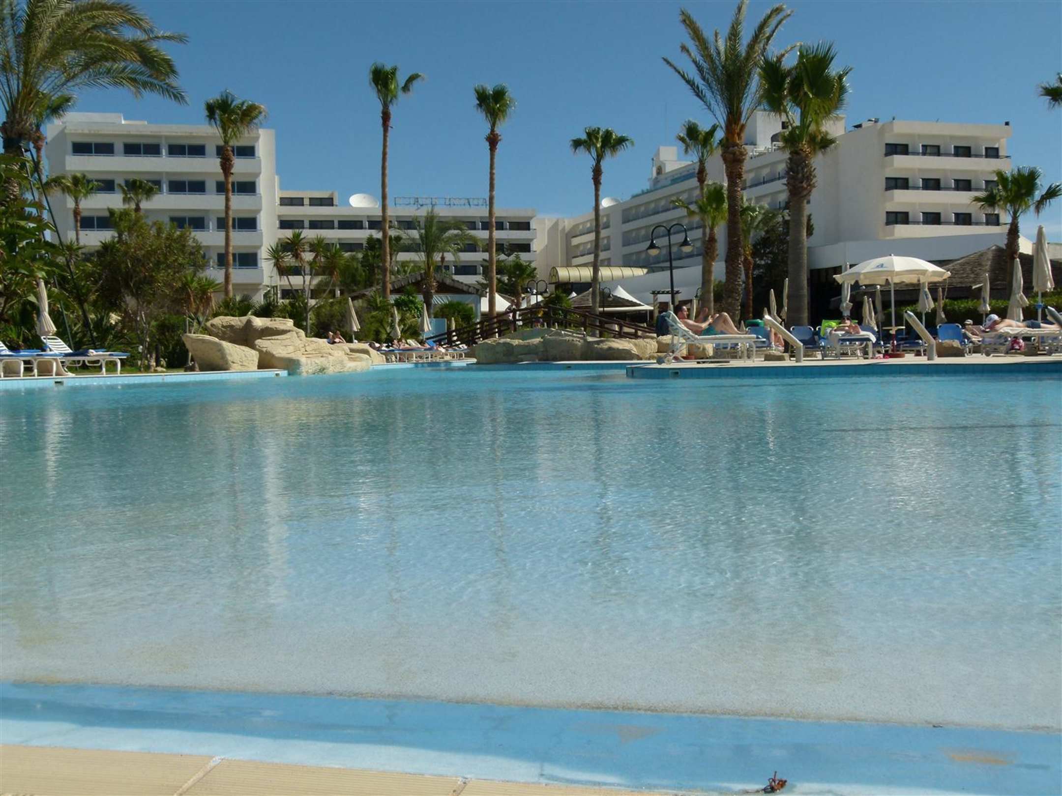 Poolbereich mit Hotel im Hintergrund
