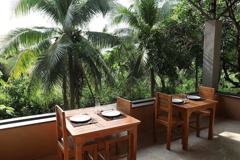 Gedeckter Bereich mit Aussicht ins Gruene