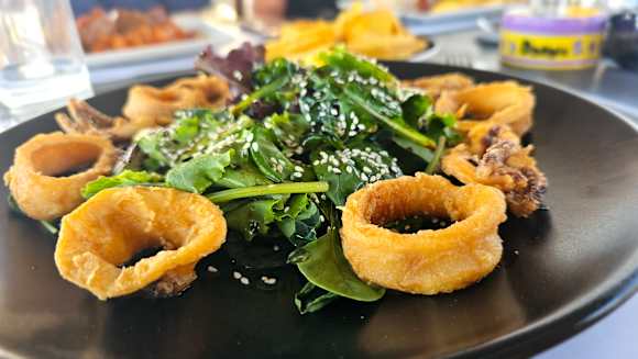 auch die Tintenfischringe mit Salat und Kartoffelecken waren lecker