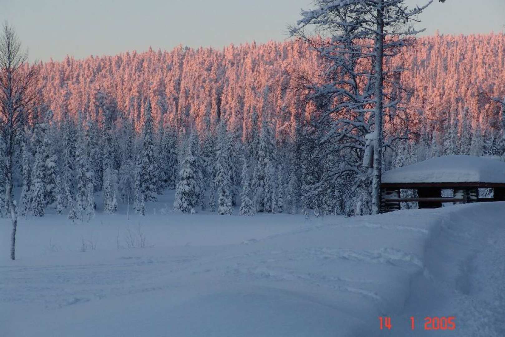 Ausblick auf den "SEE" neben der Lodge der im Winter natürlich zugefroren und tief verschneit ist. Rechts sieht man die Sauna mit Direkteinstieg in ein Eisloch des Sees..