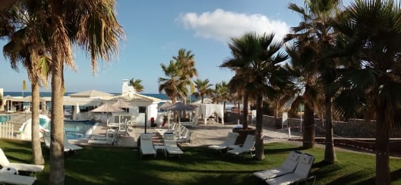 Schöner Ausblick von der morgendlichen Frühstücksterasse auf den Pool/Barbereich.