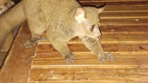 Buschbaby zum Bananenfüttern gekommen
