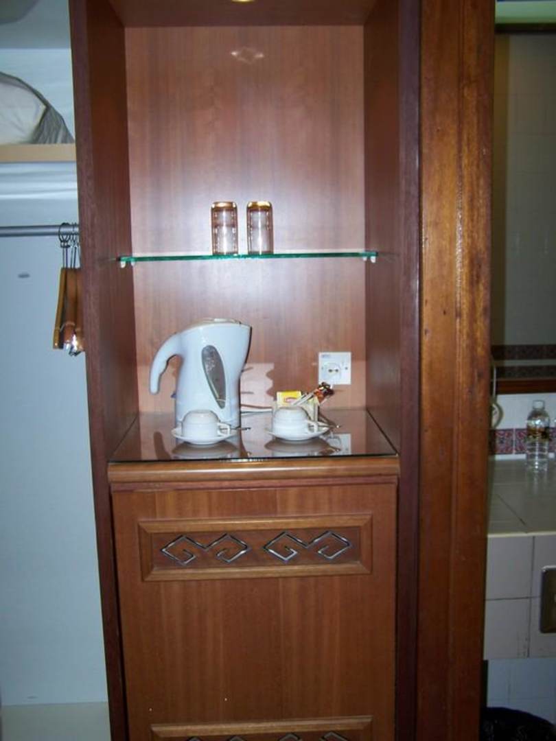 Kühlschrank, Safe, Wasserkocher und Wandschrank