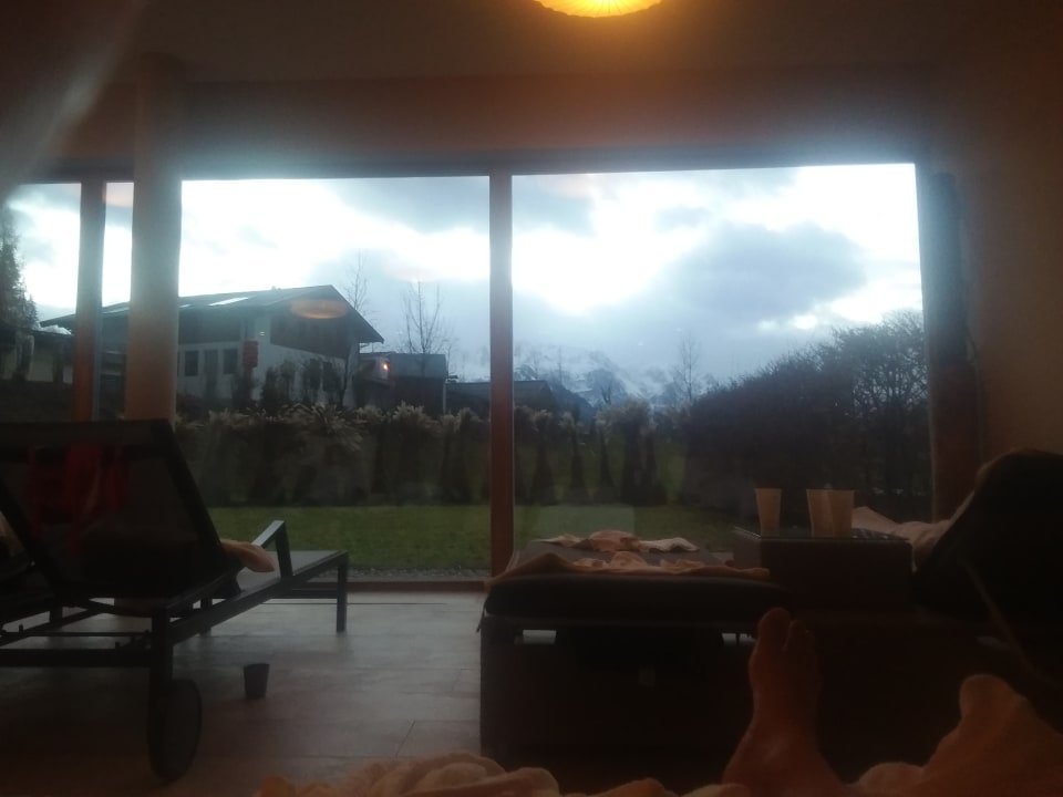 Die Sicht aus dem Wellnessbereich (hier leider durch die Wolken eingeschränkt) ist gigantisch alles ist verglast und aus jedem Bereich der Sauna/Pool Area ist das Bergpanorama zu sehen. Man kommt schnell ins träumen.