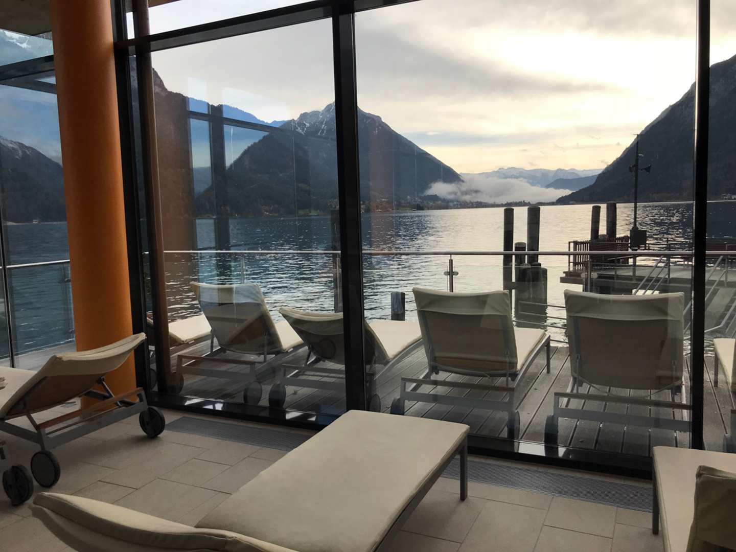 Vom Wellnesse-Liegebereich zum Aussenbereich und See