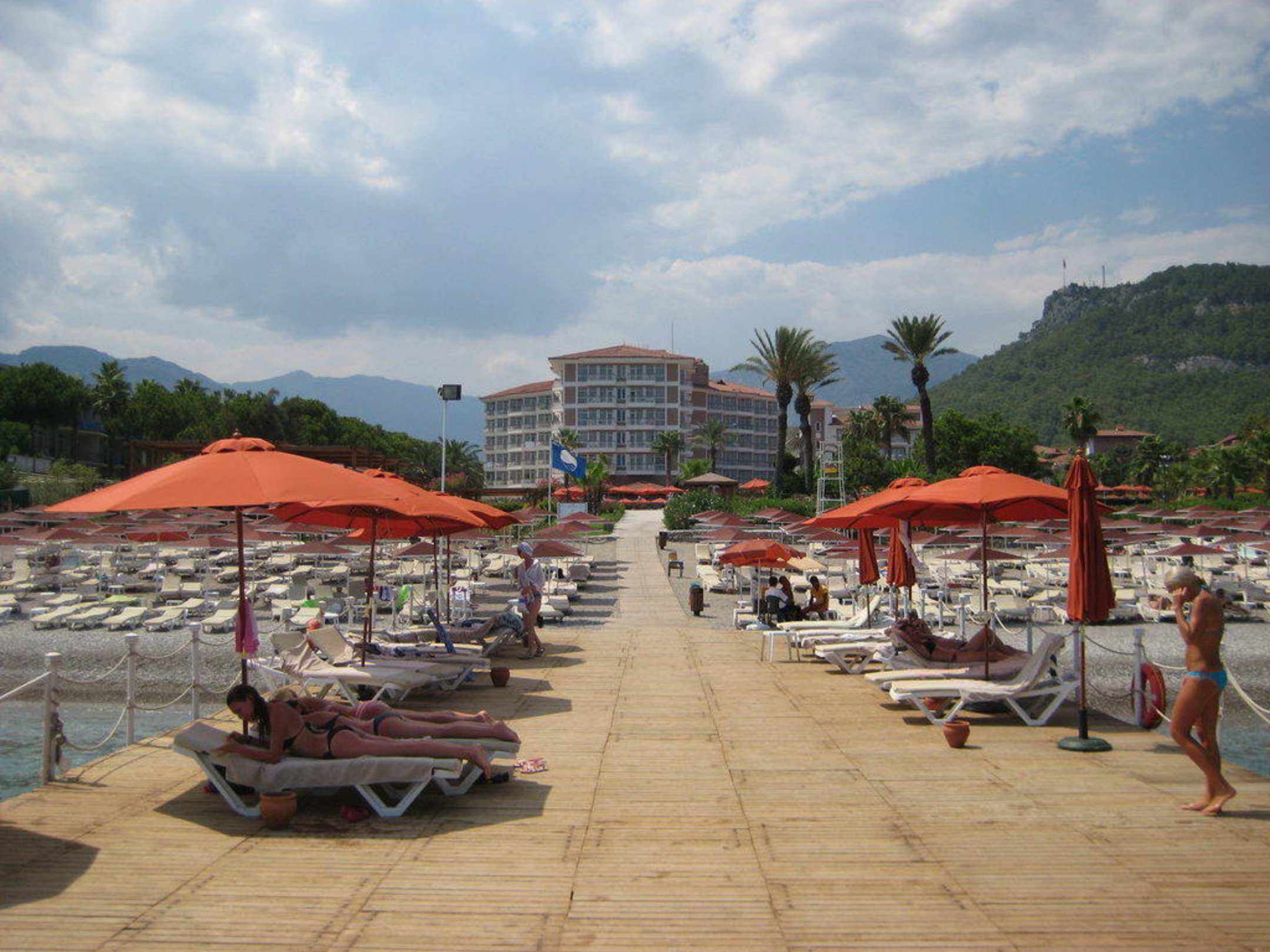 Blick vom Badesteg zum Strand. Im Hintergrund das Hotel.
