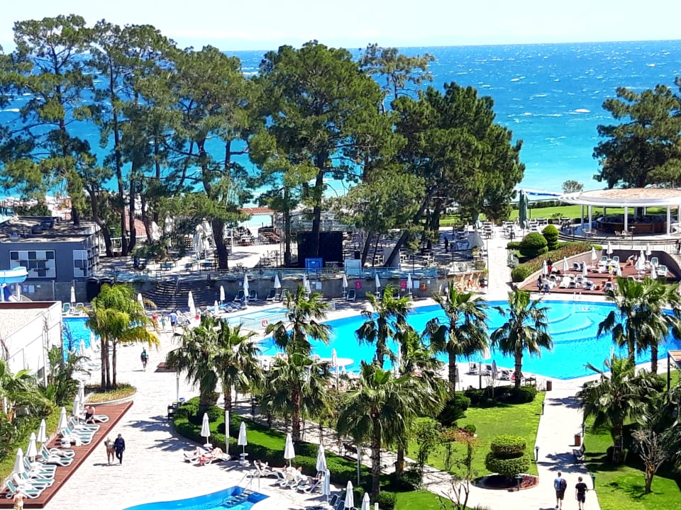 Blick von der oberen Hotelterrasse zum Meer hin.