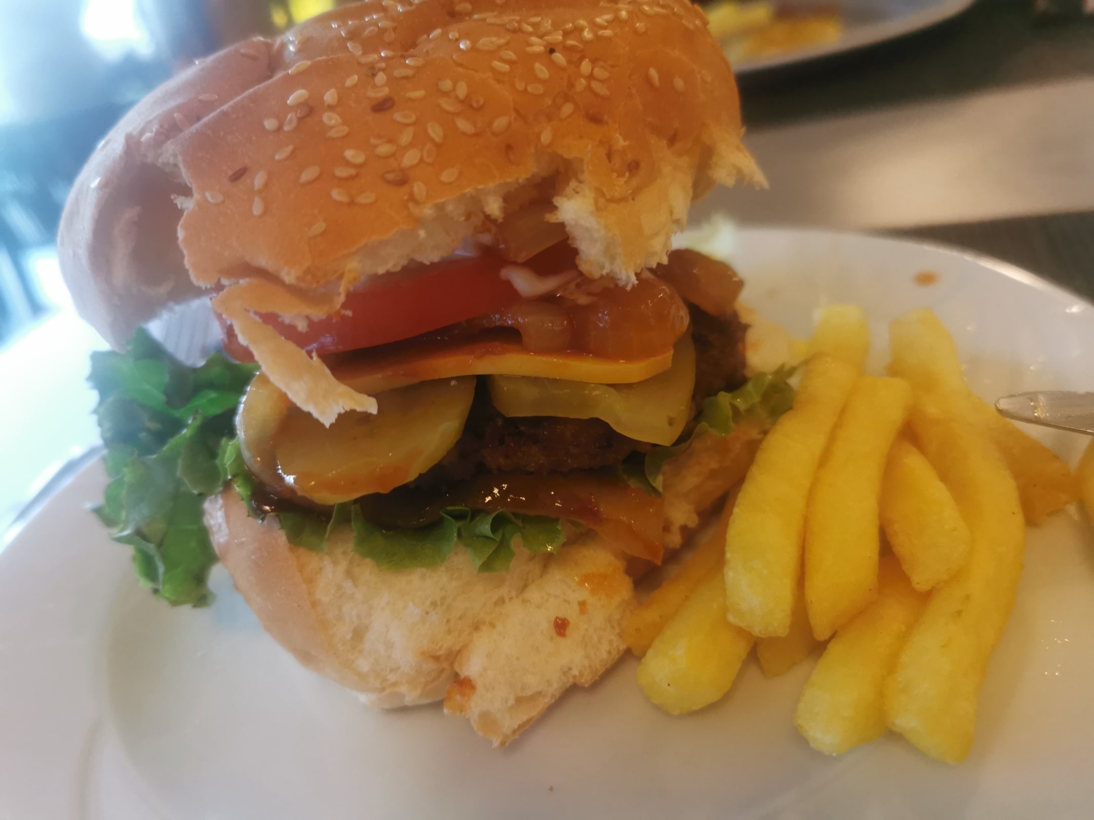 Im Hauptrestaurant. Burger konnte man sich selber zusammen stellen. Sehr sehr lecker.