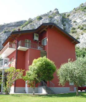 Roter Hotelteil mit Garten