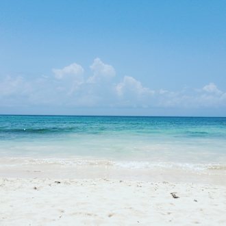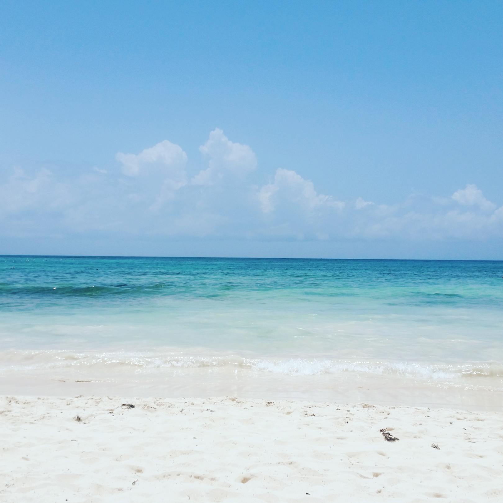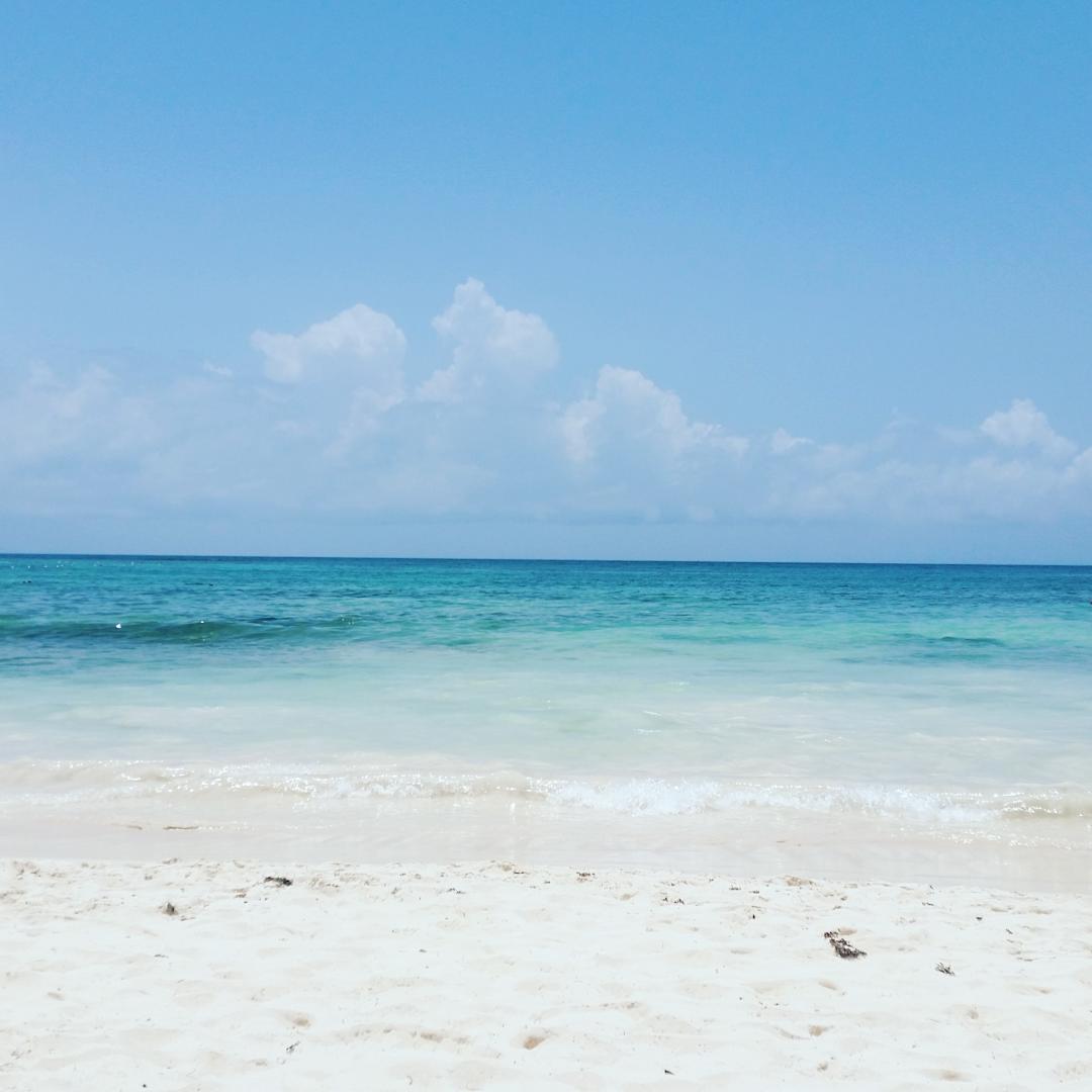 Türkisfarbenes Meer. Angespülte Braunalgen werden von morgens an weggeräumt. Einfach schön!