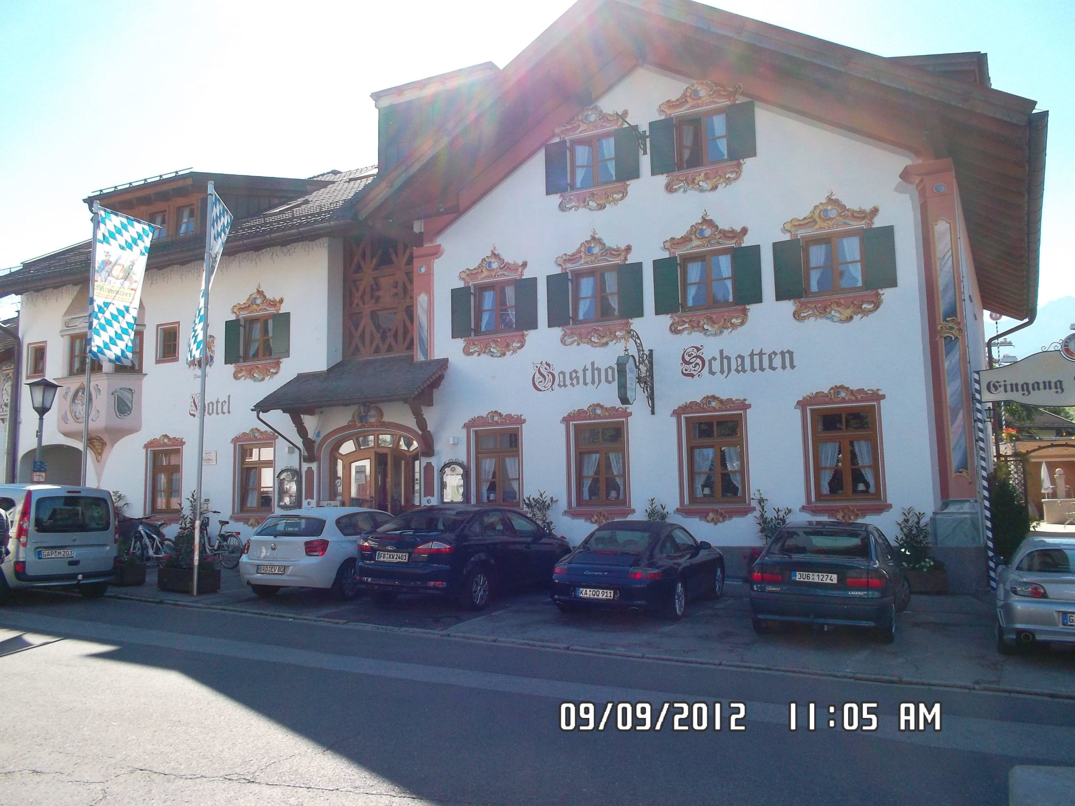 Rechts neben dem Gebäude kann man in den wunderschönen Biergarten