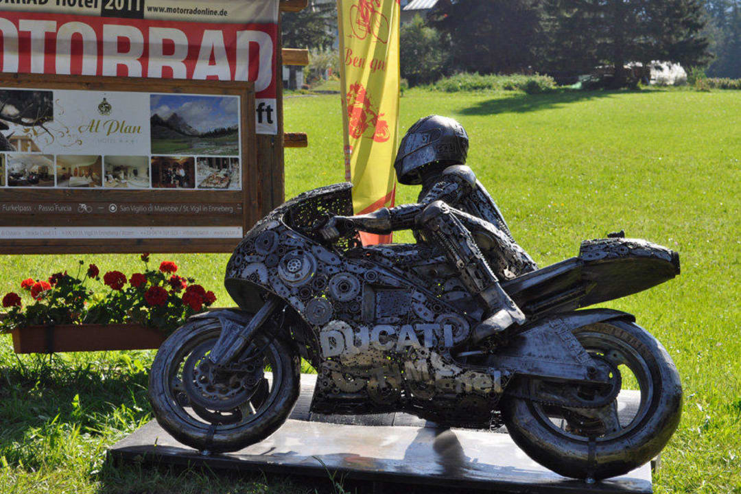 Skultpur von Valentino Rossi vor dem Hotel Al Plan