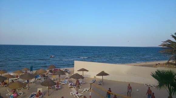 Foto vom BalkonHier sieht man den rechten Teil des Strandes, mit der Mauerbegrenzung zum nächsten Hotel.