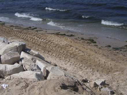 Baggerspuren am StrandNachdem der Bagger den ganzen Tag zwischen den Urlaubern hin und her fuhr, blieben am Ende nur noch seine Spuren im Sand übrig.