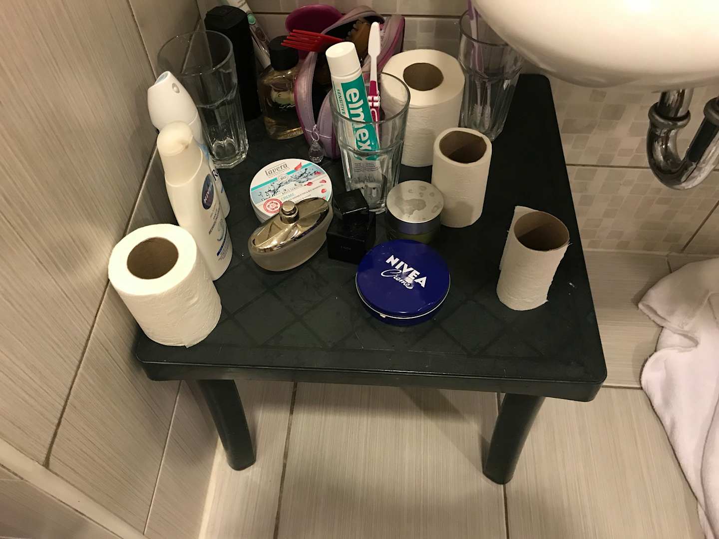 Keine Ablagen nur dieser Hocker aus grüner Plastik