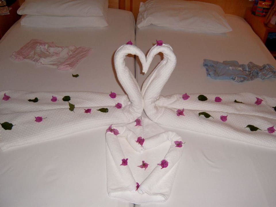 2 Schwäne und mit Blumen gemachtes Bett von den Putzfrauen.