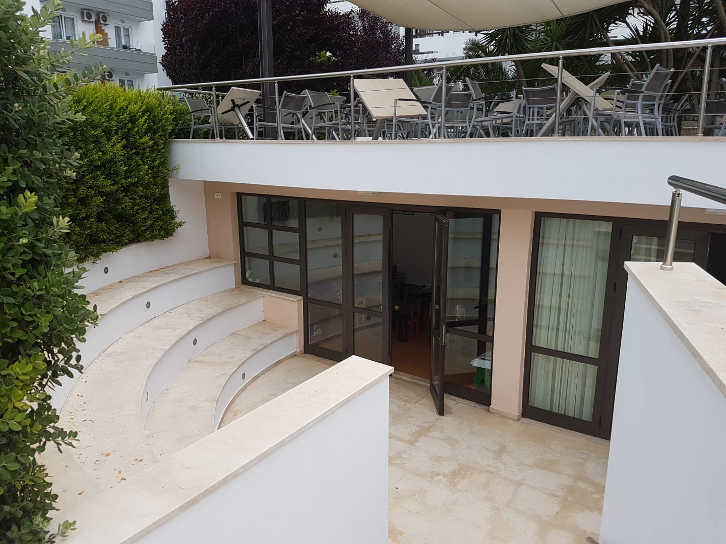 Essensbereich draußen mit Kinderspielecke drunter