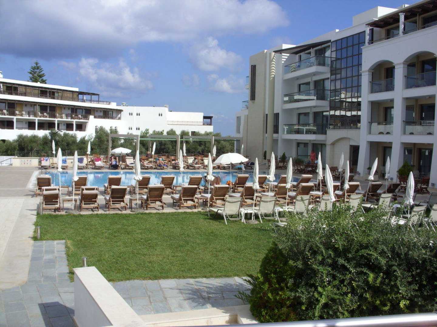 Ein Pool mit den zugehörigen liegen und einem Teil des Hotelgebäudes