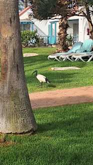 Das ist ein Ibis. Es gibt fiele von diesen Vögeln. Es gibt auch noch Silber Reiher. Man muss beim essen a7fpassen, wen man drausen sitzt. Sie essen am liebsten das Rührei von den Tellern.