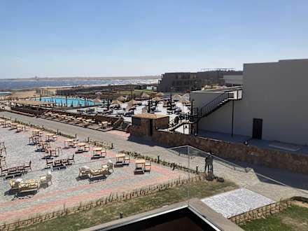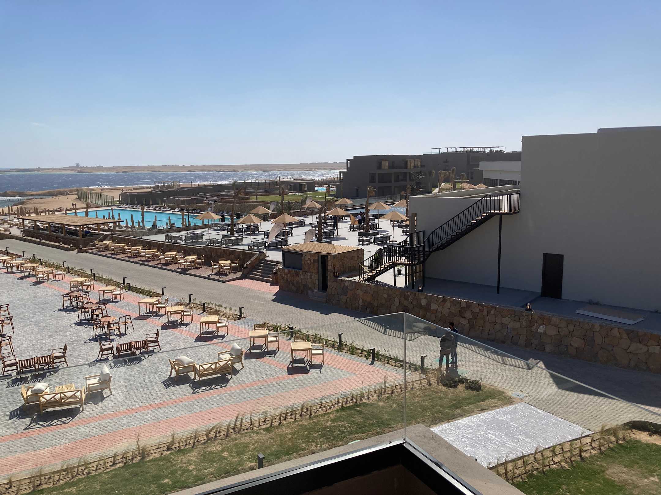 Blick vom Zimmerbalkon auf Plaza und großen Pool und Bucht