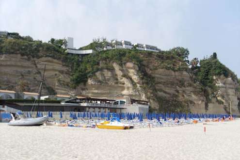 Blick nach obenDiesmal der Blick vom Strand aus zum Hotel.Man sieht die Pizzeria und die kleine Bar(überdacht),wo man sich herrlich hinsetzen kann.Die Pizza ist köstlich und man hat einen super Blick auf den Strand.Hoch oben sieht man das Hotel.Sieht fast so aus,als ob`s über den Felsen raus hängt.