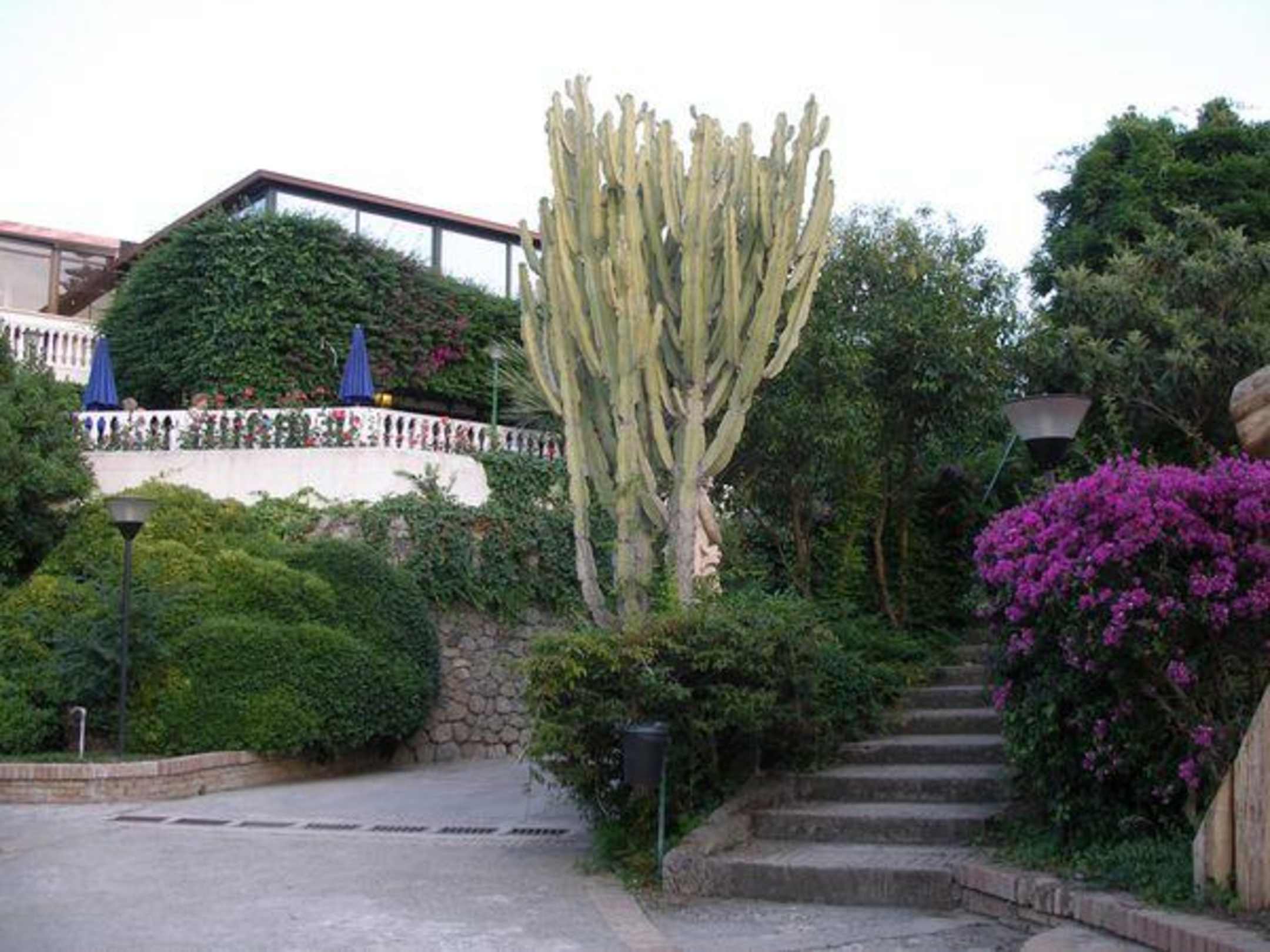 Die wunderschöne Bepflanzung der Gartenanlage sticht einem auf Schritt und Tritt ins Auge. Hier kommt man über eine Treppe zur Rückseite der Terrasse, wo sich auch die Poolbar befindet.