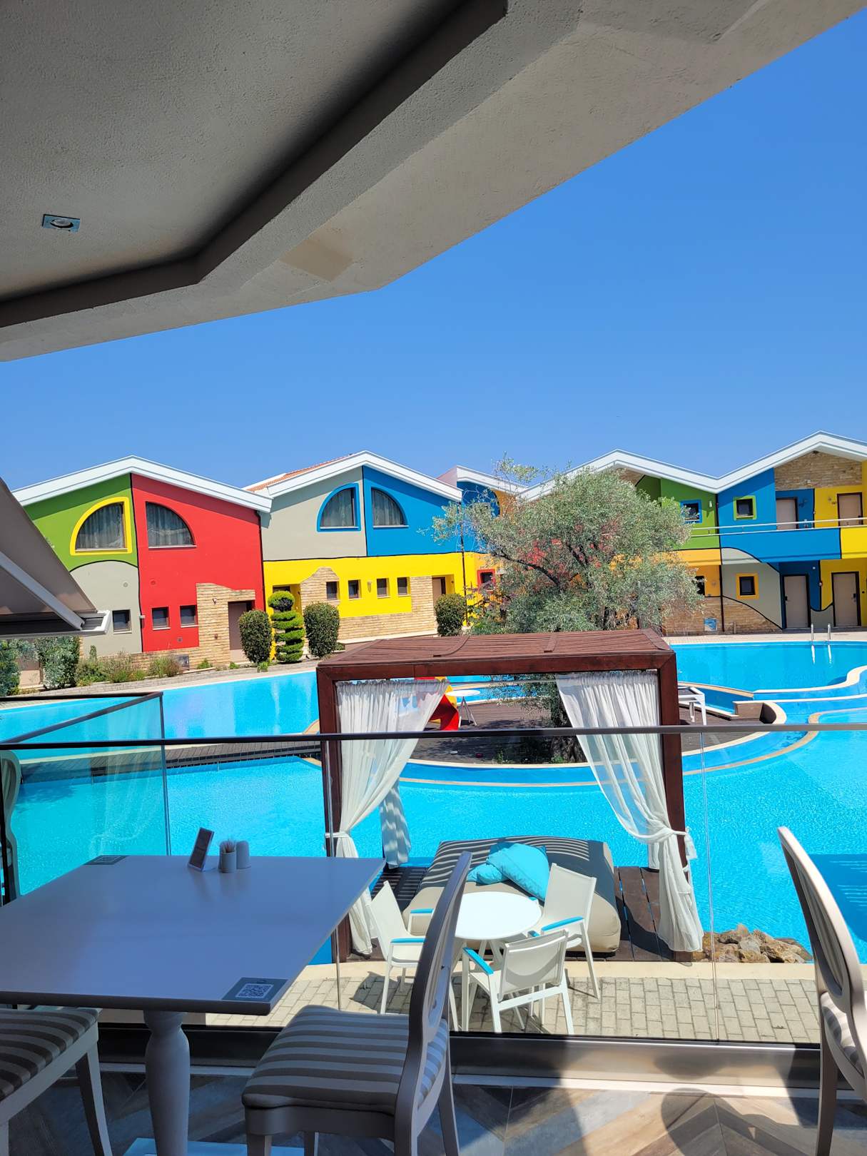 Ansicht von der Terrasse auf den Pool