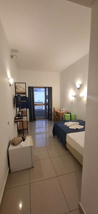 ZimmerEinzelzimmer mit Regal, Kühlschrank, Schreibtisch, Stuhl, kleiner Fernseher, Bett - aber ohne Mülleimer.