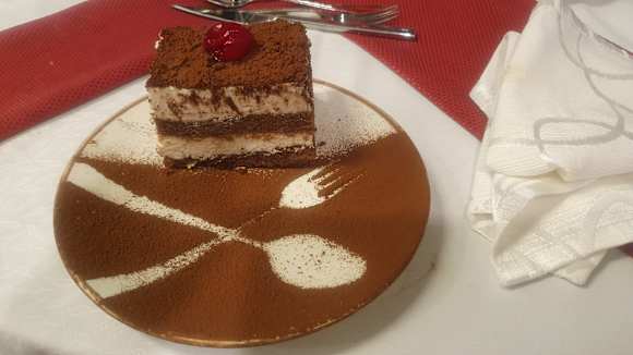 Das hübsche Dessert beim A la carte Menu. Leider können wir das A la carte - Essen nicht empfehlen. Man durfte 1x pro Woche wählen zwischen 4 Speiseangeboten. Aber die "A la carte - Ecke war im gleichen Raum mit den normalen Buffetgästen.