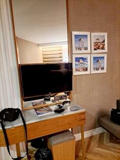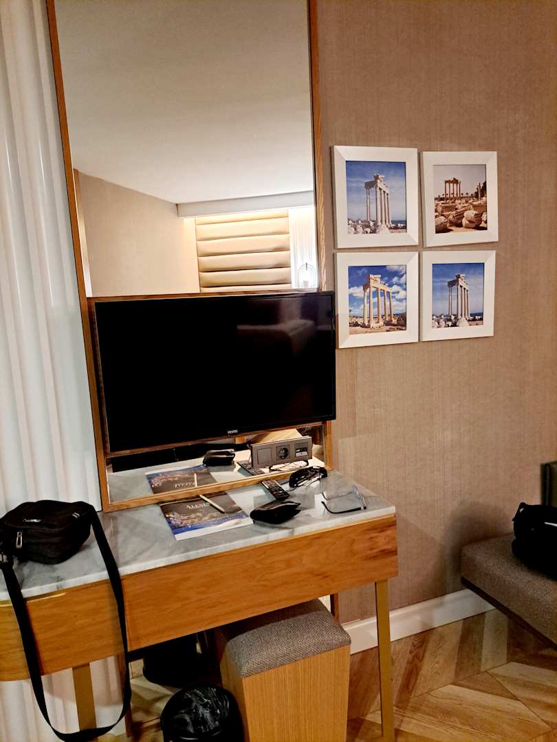 TV an Wand, nicht drehbar, Tisch und Ganzkörperspiegel, der so nicht benutzbar war.