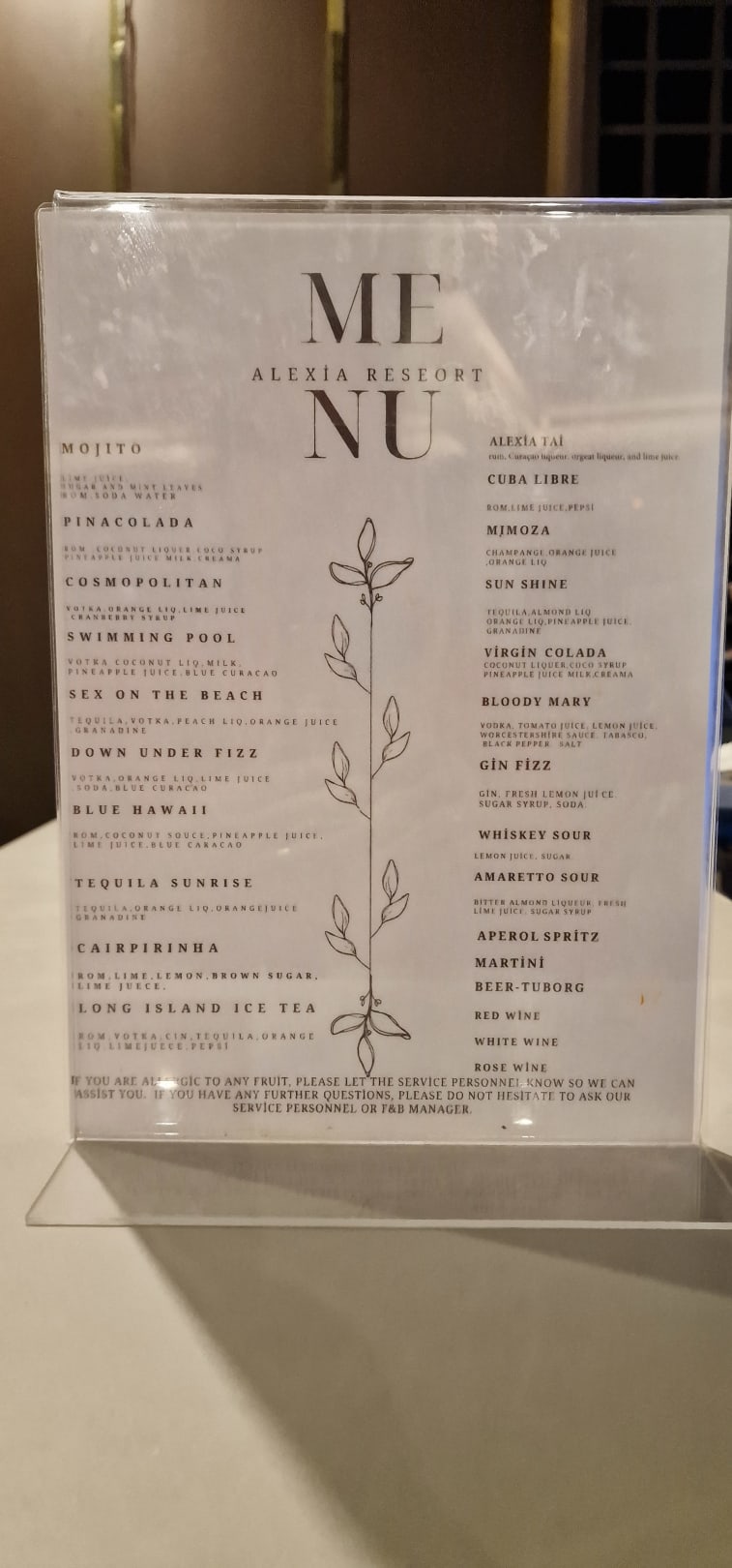 Getränkekarte in der Lobby sehr lecker