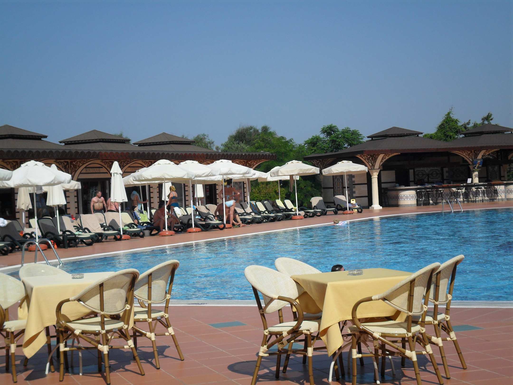 Pool in der Hotelanlage mit kleinen Geschäften