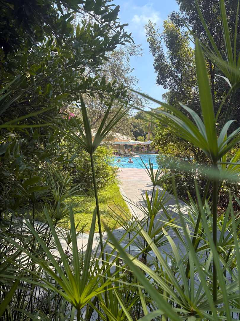 Blick auf einen der verschiedenen Pools. Gepflegtes Grün überall.