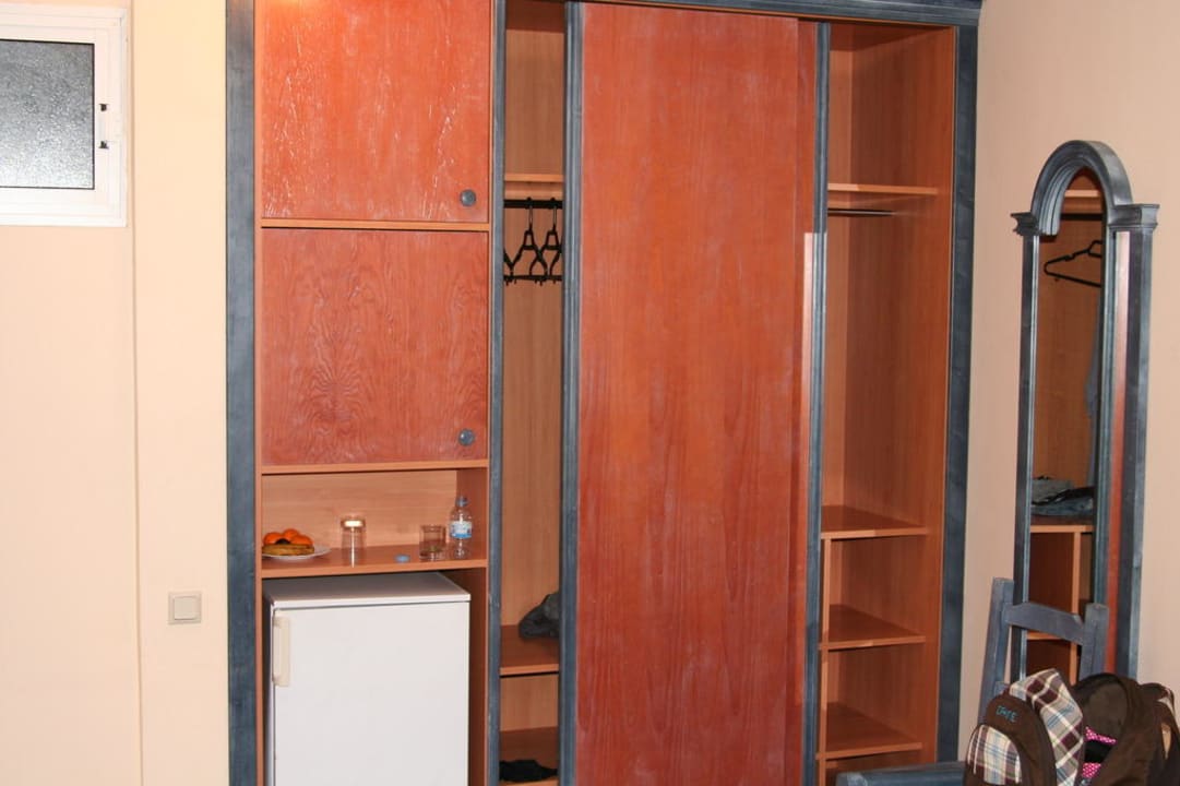 Hier ist der Einbauschrank im Wohnzimmer. Neben dem integrierten Safe und Kühlschrank bietet dieser hinter den beiden Schiebetüren viel Platz für die Textilien von Männlein und Weiblein.