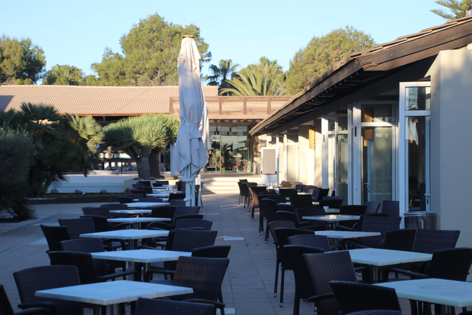 Sitzgelegenheiten zwischen dem Restaurant (links) und einer der Bars (rechts)